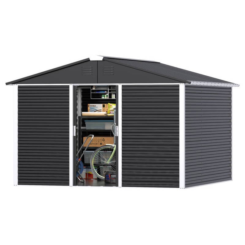 2.The overall panels of the metal outdoor storage shed are designed with grooves to help drain water and prevent moisture from the tools stored in the storage shed, the dual sliding doors are also designed for easier access, sliding the doors open and closed to save more storage space.