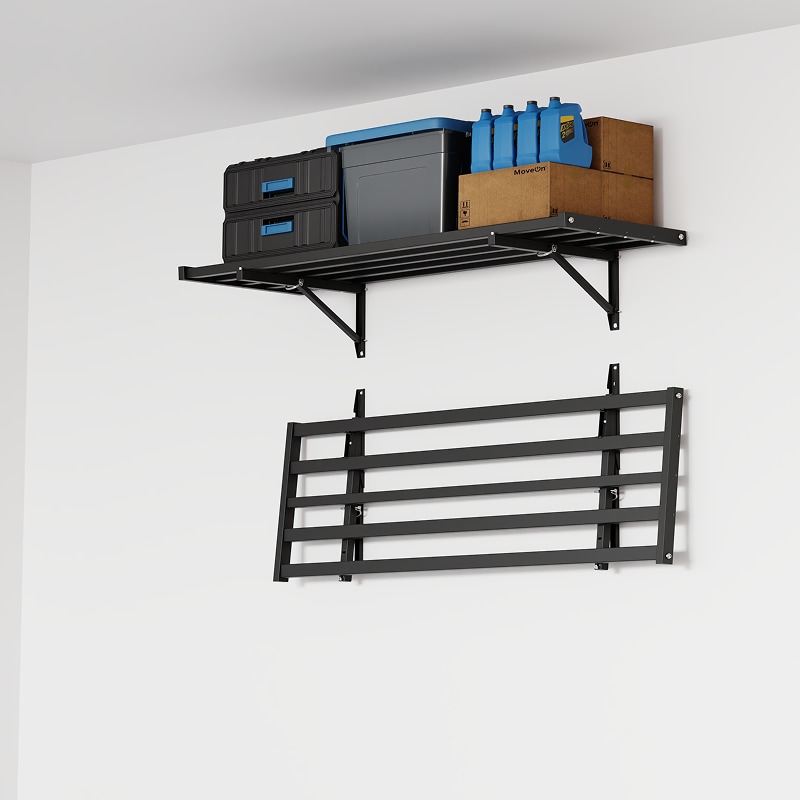 1.Folds Flat When Not in Use: No more permanent garage shelving blocking your space. Unlike fixed garage shelves that permanently stick out, this fold-down garage shelf flips flat against the wall to instantly restore full garage clearance.