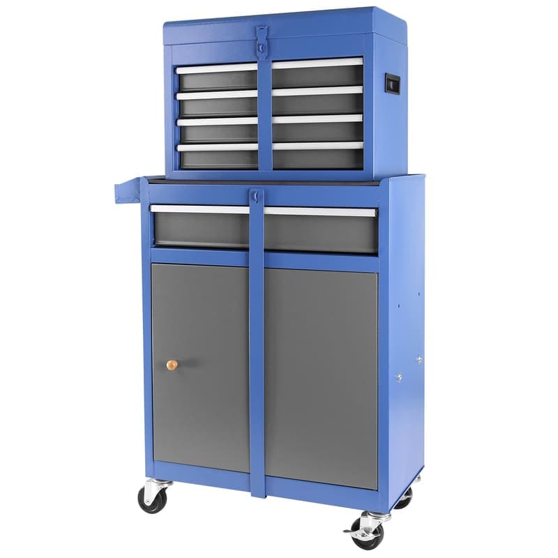 1.Versatile 2-in-1 Design: Converts between 4-drawer tool box and rolling cabinet, with nested storage option.2.Ample Storage: Top tray, 5 drawers, large cabinet, side tool box, adjustable shelf.3.Secure and Protective: Locking bars, buckle, and protective liners ensure tool security and prevent damage.4.Easy Mobility: 4 universal wheels (2 lockable) for effortless movement and stability.5.Durable Construction: Heavy-duty steel, strong load-bearing capacity.