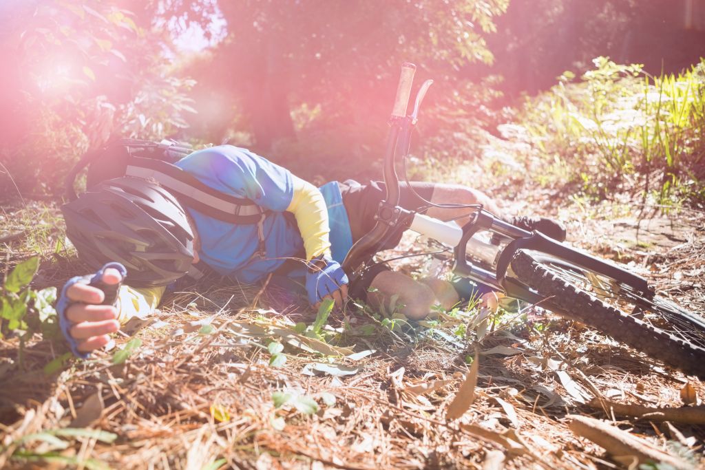 Male mountain biker fallen from his bicycle in forest on sunny day[/caption]