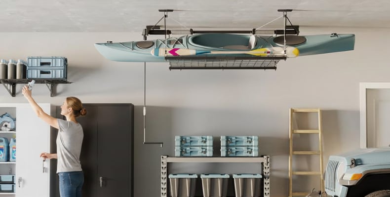 A smarter solution is the Fleximounts GL1 4x4 FT Garage Lifting Storage Rack. Instead of climbing ladders and risking injury, this system allows you to raise and lower storage using a crank or power drill. It lifts up to 108 inches vertically and supports up to 300 pounds, making it ideal for seasonal storage, tools, bins, and even larger items like kayaks or rooftop carriers.