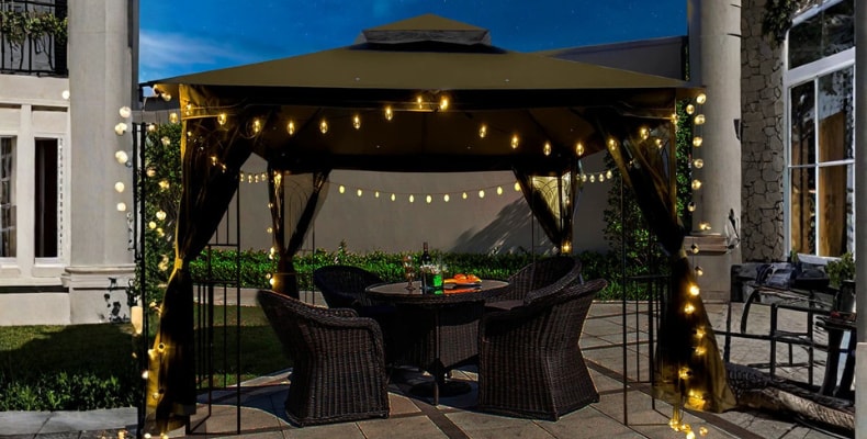 Use lanterns instead of traditional candle holders. Their enclosed structure pairs beautifully with the gazebo frame and feels secure in outdoor settings. Drape soft fairy lights along the inside beams. The ventilated double roof helps prevent heat from building up, which is useful if you use multiple candles and lanterns.