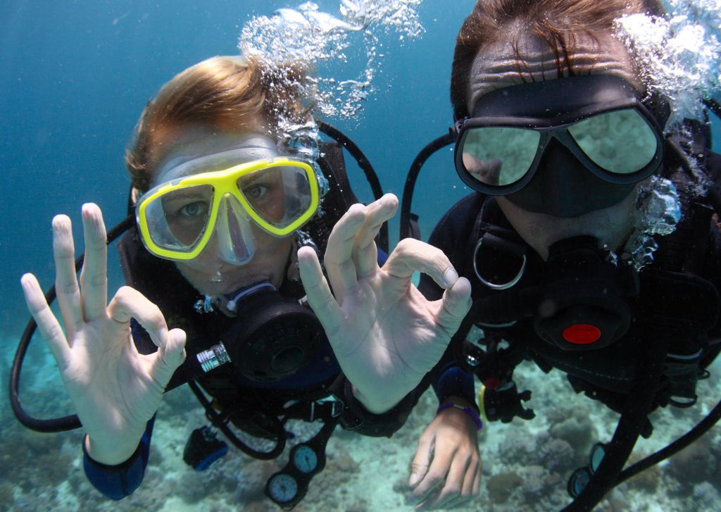 Scuba divers showing OK signal underwater[/caption]