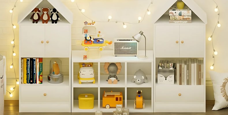 This isn't just a bookshelf; it's a full-on storage command center. It blends open shelves with a closed cabinet, meaning your child can display their favorite books while you discreetly hide the clutter. The house-shaped top adds a touch of whimsy, making it feel like a playhouse rather than a piece of storage furniture.