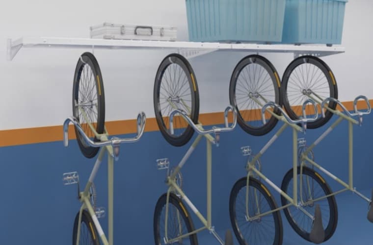 The BR24 Wall Shelving may double as bike racks when equipped with the GRH2/GRH2B hooks. In addition to holding bikes, the hooks may also carry tools and other items that can be hung vertically.