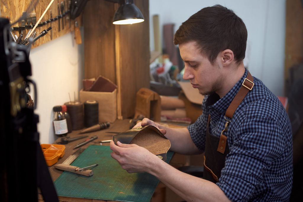 Working process of the leatherman in the workshop. Young craftsman works with natural leather using craft tools. Working with genuine leather. A small business of a craftsman. The photo can be used for needlework, handicrafts, creating leather products, hobbies, hand-made products, own small business, own production.[/caption]