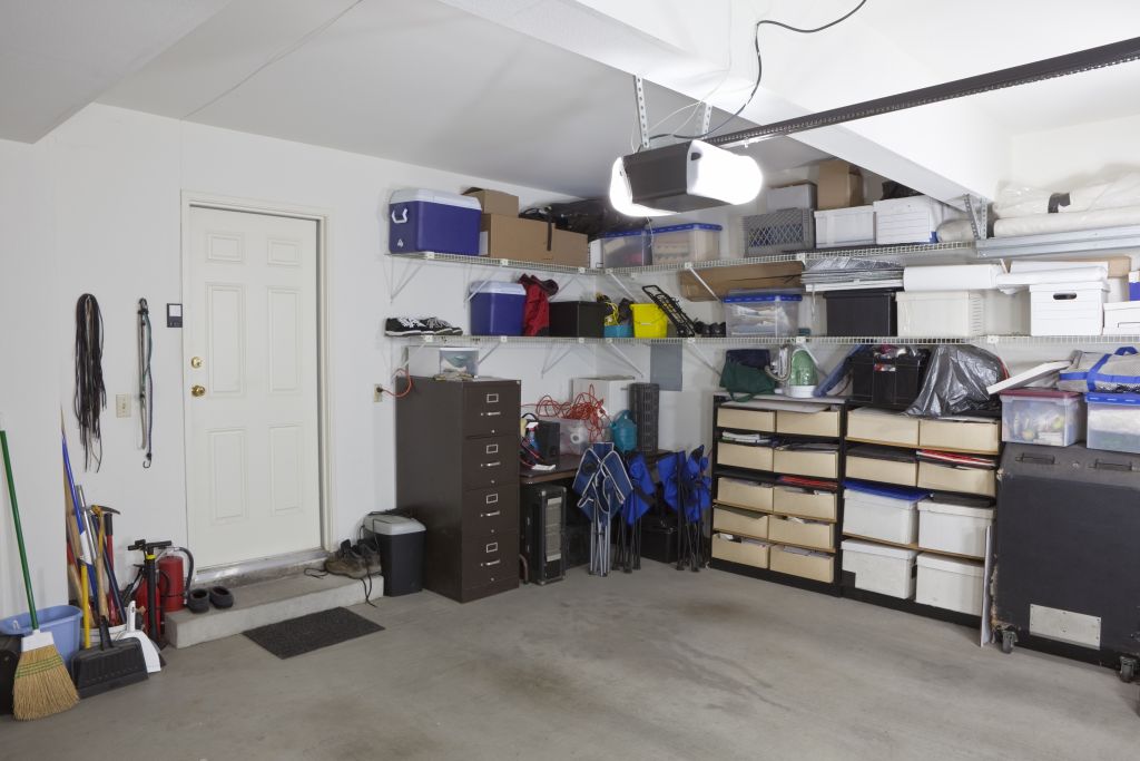 Simi untidy suburban garage with shelves and storage.[/caption]