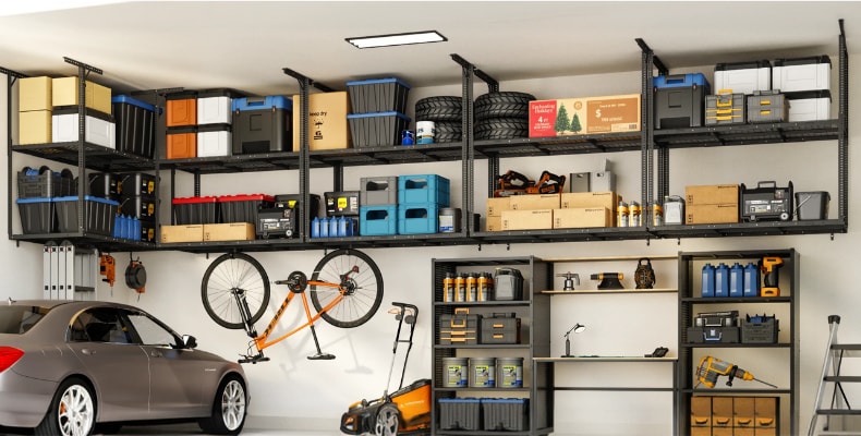 Overhead racks are ideal for items you do not need every week. Holiday decorations, camping gear, and large bins can live safely above your car. Wall shelves and corner units are perfect for tools, supplies, and smaller equipment. Hooks add even more flexibility by holding bikes, ladders, and yard tools without taking up shelf space.