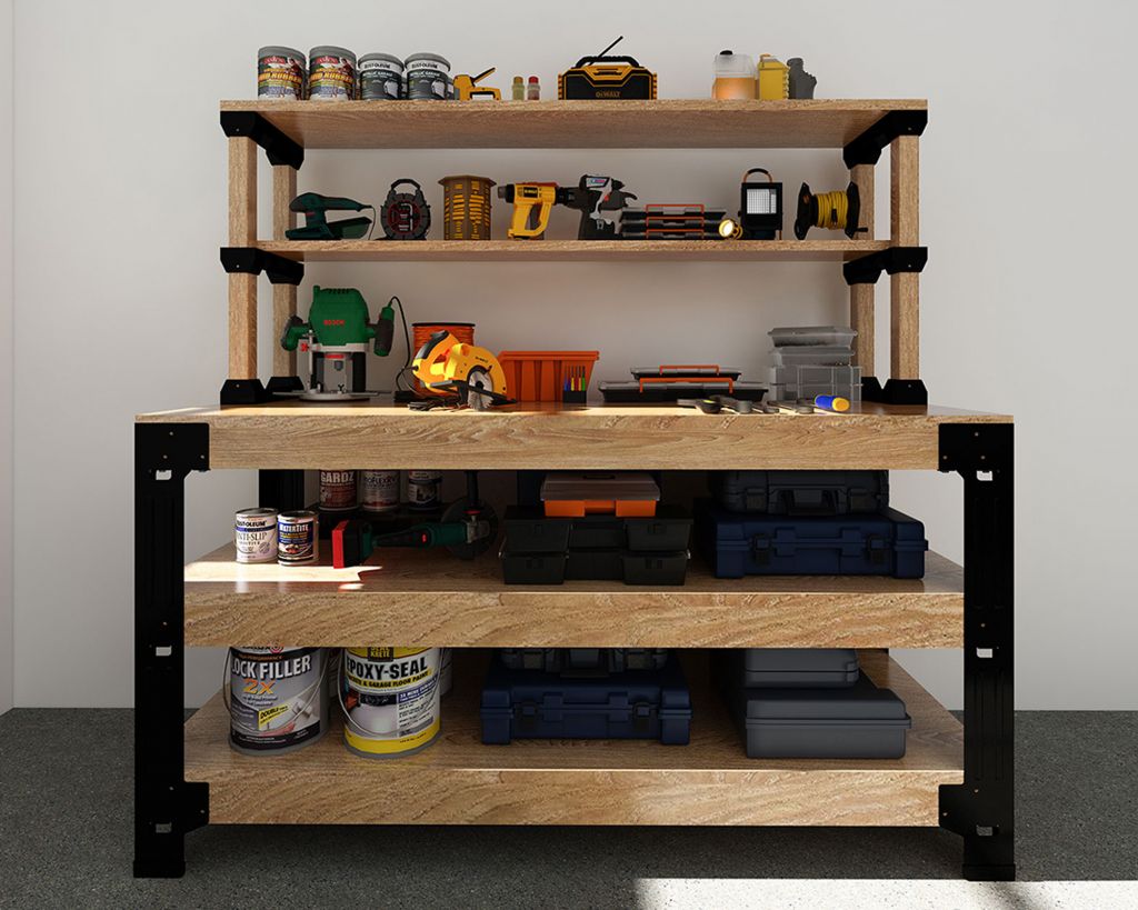 One such reliable workbench that you can maximize when working is the Fleximounts WB107 Customizable Workbench Shelving Frame, which is priced at $89.99 to $94.99.This workbench is made of heavy-duty steel, specifically iron-made workbench legs, making it possible to store twice the storage than traditional workbenches. Its iron-made workbench legs last for years. Plus, it has top-quality stainless steel screws. The workbench has a loading capacity of up to 1000 lbs per shelf, offering dependable load-bearing performance.The WB107’s lumber color and finish can be customizable to suit your taste–you can stain, paint or finish the wood as desired. The maximum dimension of the workbench is 96 inches in length, 48 inches in width, and adjustable in height. The workbench is flexible enough to be utilized for multiple uses for the garage, such as assembling tables, potting benches, or even as a study desk for home. Moreover, building this workbench on your own at the comfort of your home garage is possible as the package already includes all the necessary hardware.