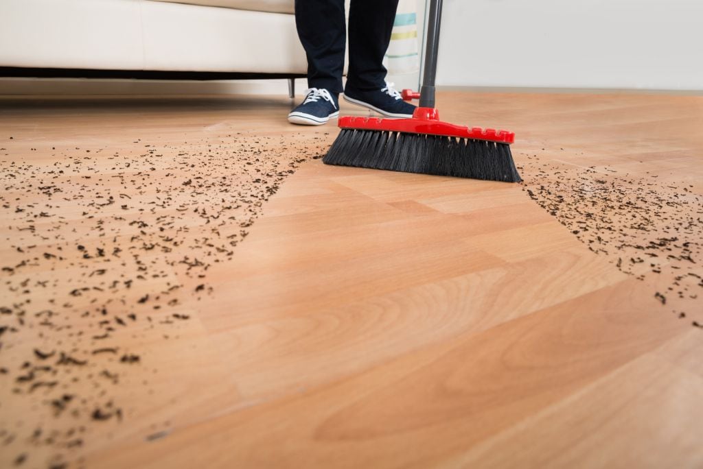 High angle view of broom cleaning dirt on hardwood floor at home[/caption]