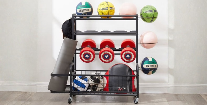 This is where the Fleximounts FSB1 makes its quiet entrance. Its four-tier metal design doesn’t just hold your equipment; it displays it like a curated collection. Basketballs, yoga mats, larger balls, tennis rackets, and footballs each find a home. The open shelves make everything visible and reachable, so you can grab what you need and go. No more digging through boxes like you’re on an archaeological expedition.