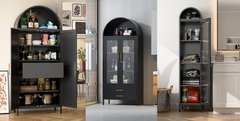 The arched design, paired with glass doors, creates an illusion of openness while showcasing your prized possessions. Whether it’s your collection of first-edition books or that quirky vase you scored at a flea market, this cabinet makes everything look deliberate and curated.