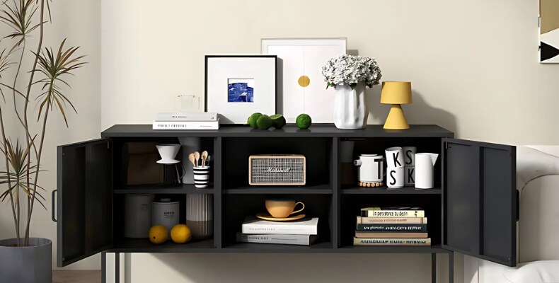 The Fleximounts BC2 47-inch Metal Buffet Sideboard Cabinet offers six spacious compartments, giving every item its place. No more stacking bowls precariously or playing Tetris with your dinnerware. With everything neatly organized, you can find what you need in seconds instead of rummaging through cluttered shelves.