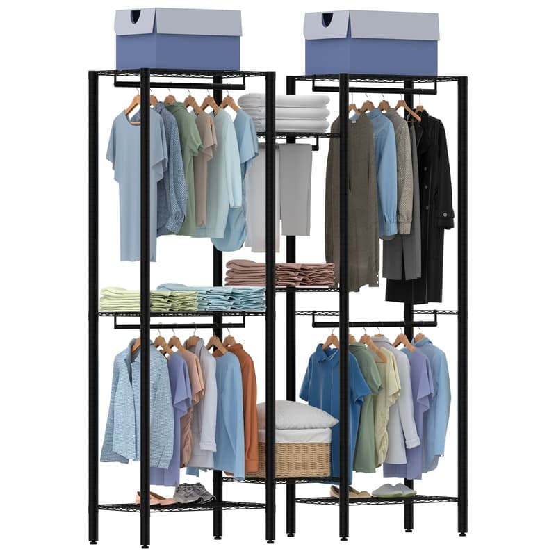 1.With dimensions of 75”Lx18”Wx77”H and a weight capacity of 1210lbs, this clothing rack can accommodate nearly 100 pieces of summer clothing, 10 handbags, and 10 pairs of shoes. Ideal for use in bedrooms, laundry rooms, clothing stores, walk-in closets, and more, providing ample storage space for your wardrobe essentials.