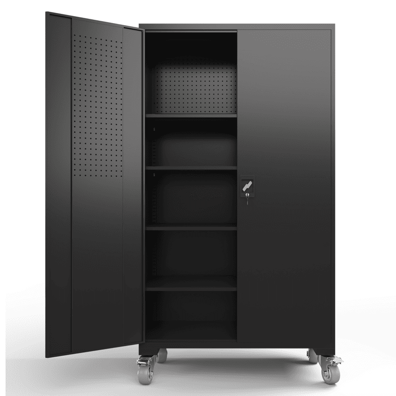1.30% wider than ordinary metal storage cabinets in the marketk,New generation of garage cabinet features 2 built-in us standard size pegboards in the locking doors and 1 removable pegboard on back panel to maximize the storage space of the cabinet.