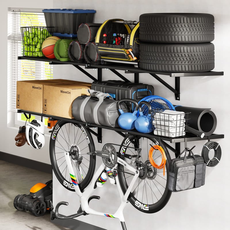 1.1600 lbs Tested, 800 lbs Total Rated Capacity: Double-tested for safety, each reinforced steel shelf in this garage wall shelving system supports up to 400 lbs, providing rock-solid stability for tools, storage bins, garden supplies, sports gear, cleaning items, and heavy equipment.