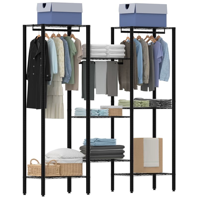 1.With dimensions of 69”Lx16”Wx77”H and a weight capacity of 1000 lbs, this clothing rack can accommodate approximately 87 to 100 pieces of clothing, 29 to 37 dresses, and 12 to 16 pairs of shoes. Ideal for use in bedrooms, laundry rooms, clothing stores, walk-in closets, and more, providing ample storage space for your wardrobe essentials.