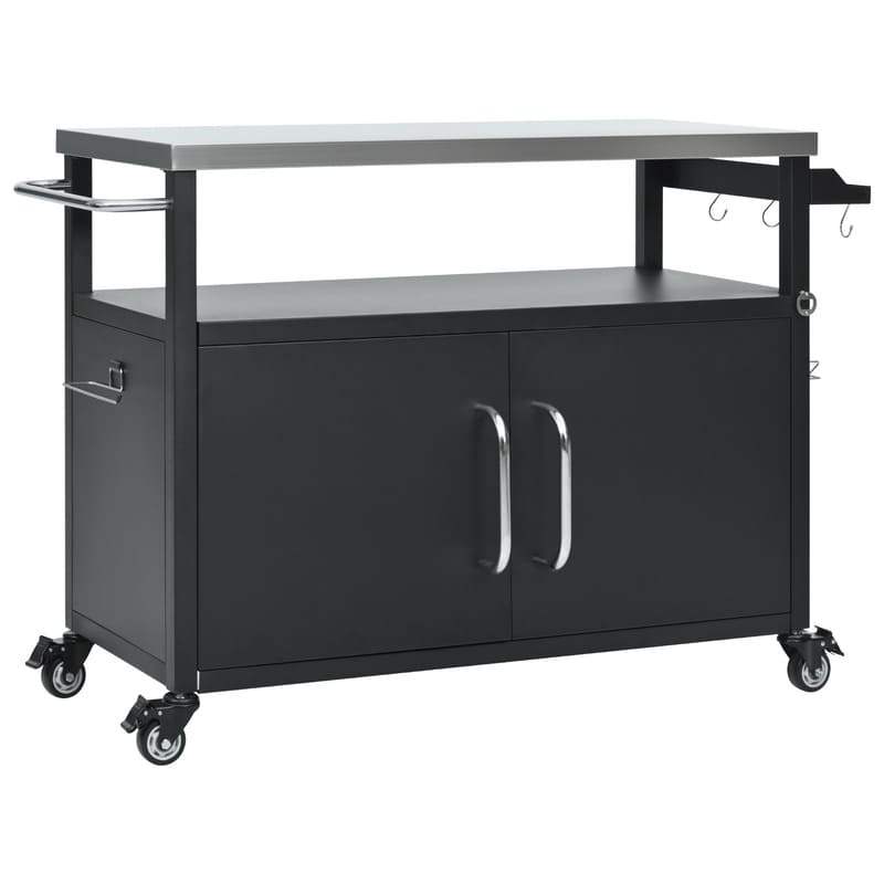 3.One side of the shelf has four “S” shaped metal hooks for hanging outdoor tools. The left side of the product has a paper towel holder and a trash holder on the right side, bringing convenience to avoid outdoor pollution.