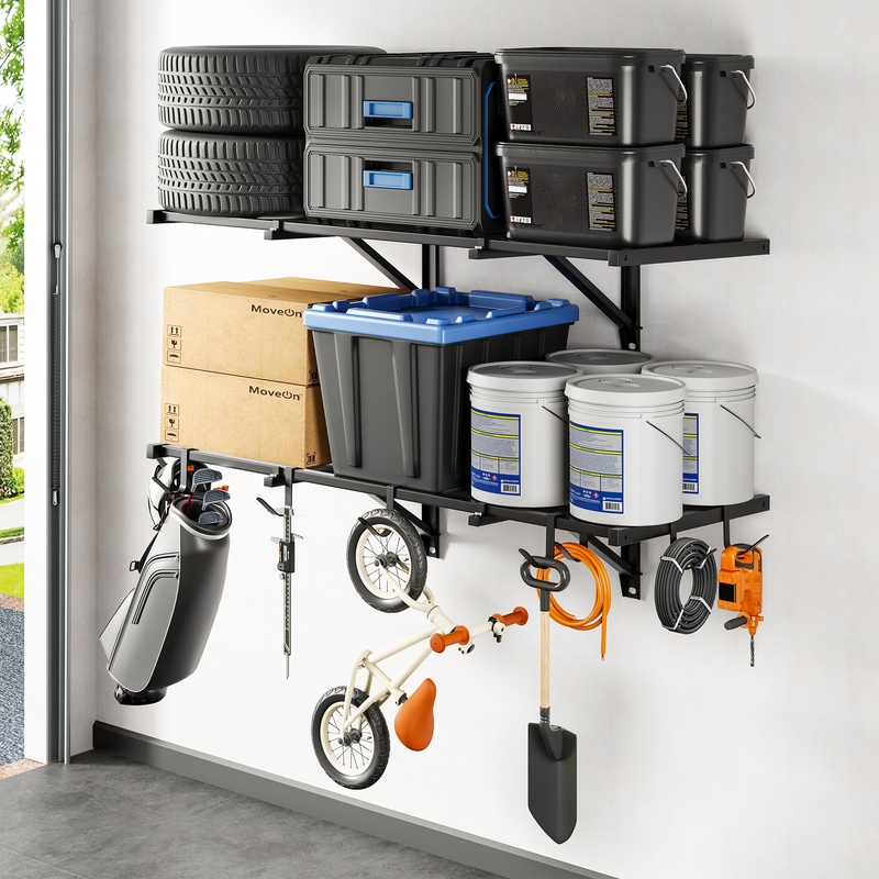 1.1600 lbs Tested, 800 lbs Total Rated Capacity: Double-tested for safety, each reinforced steel shelf in this garage wall shelving system supports up to 400 lbs, providing rock-solid stability for tools, storage bins, garden supplies, sports gear, cleaning items, and heavy equipment